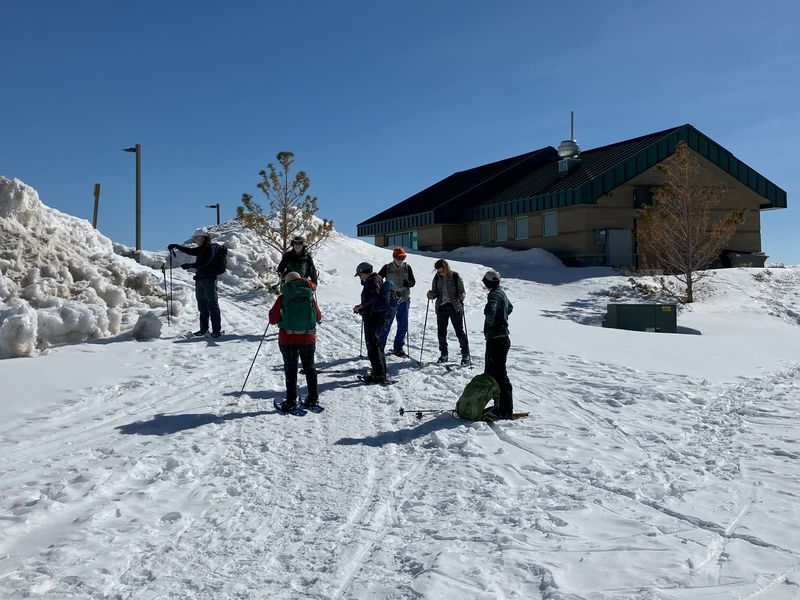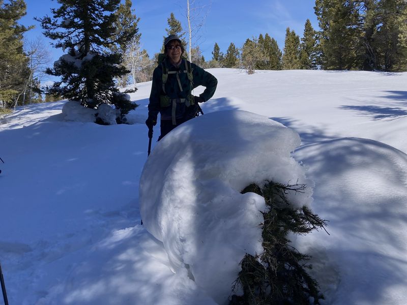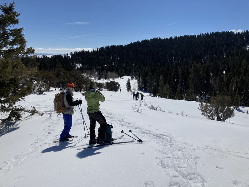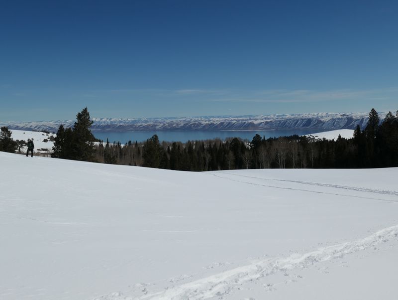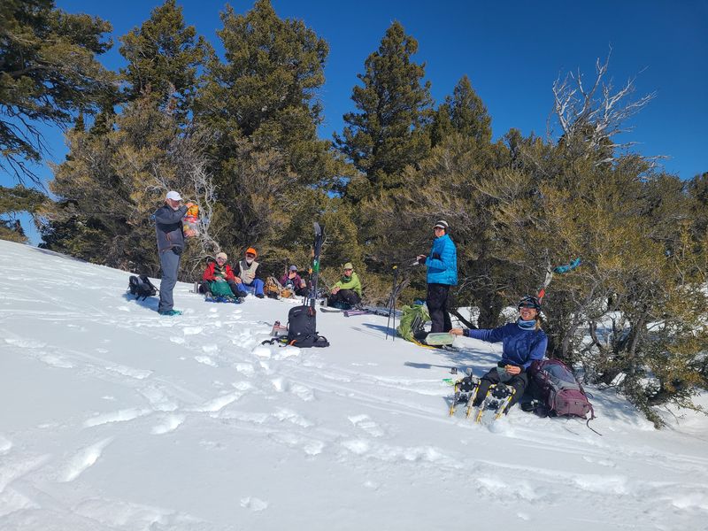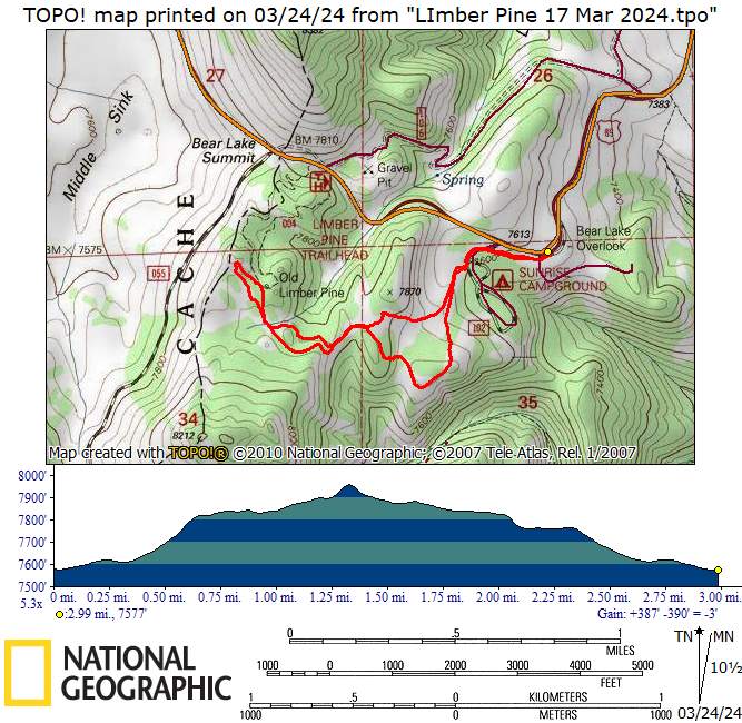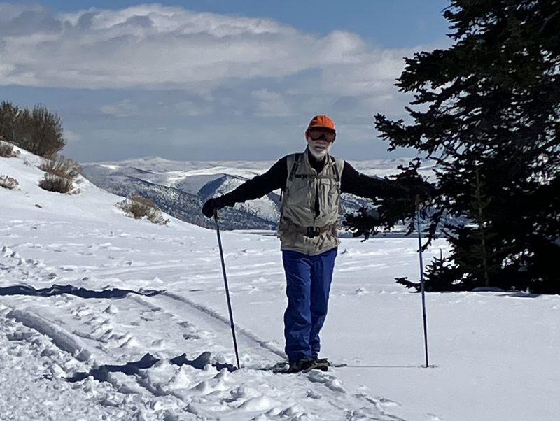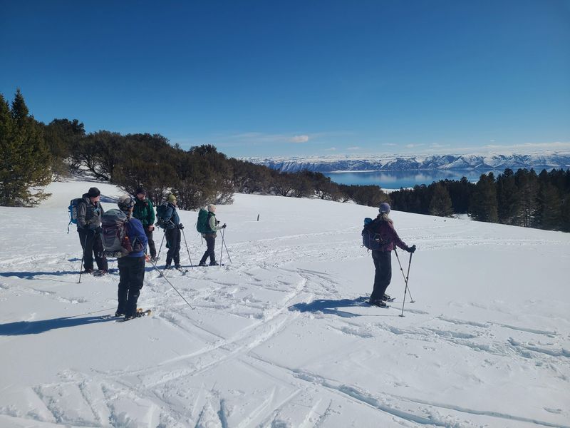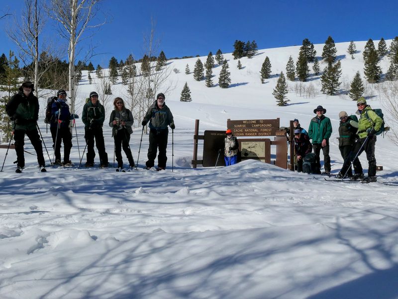 Home Bear Lake Overlook - Limber Pine, 17 March, 2024 Twelve Cache Hikers joined this last activity of winter 2024. At nearly 8000 feet, this trip from Bear Lake Overlook to Limber Pine always has reliable late-season snow. Carpools were organized at Smith's and we drove 34 miles up Logan Canyon and over Bear Lake Summit to the Bear Lake Overlook. Snowshoes and cross-country skis were donned and we headed west over a deep snow base with a couple inches of new snow on top. After stopping for a group photo at the campground, we climbed south through a large open slope. We followed our usual route, turning to the west as we continued our ascent to a low spot on the ridge. That route follows a fence line, but the snow was so deep that only a few post tops were visible. From the ridge, we turned around to admire a great view Bear Lake, with distant mountains mirrored in its sky-blue water. We then left the ridge with its mountain mahogany trees and took a contoured route through the timbered north-facing slope, eventually emerging into an open area directly south of the Old Limber Pine. A final ascent up the slope took us to the old tree, but we didn't tarry there. Instead, we headed west to the main ridge and a view of Middle Sink. The exposed ridge location was windy, so most of the group went to a more sheltered spot for lunch. It was St. Patrick's Day, so we shared green cookies. The area east of Middle Sink is reserved for non-motorized winter recreation although we often encountered snowmobiles here. This year, however, the Forest Service had placed signs along the ridge and only a few snowmobiles had encroached into the restricted area. After lunch, we took a more southerly route for our return. Several people split from the main group on the way back and traveled though the campground while the others went to the track we made on our initial ascent. This was a pleasant trip, with outstanding views, good weather and snow conditions and good company, too. Trip Summary:
