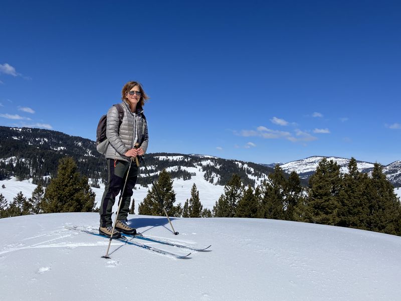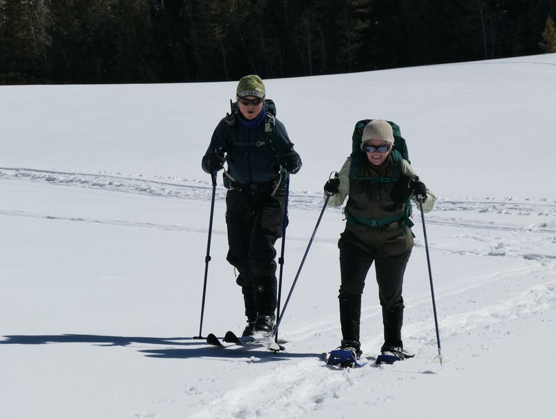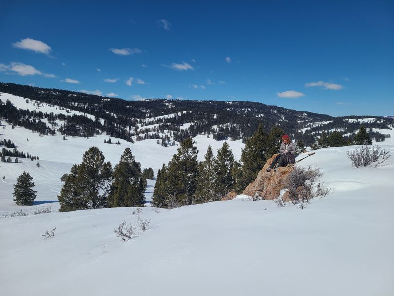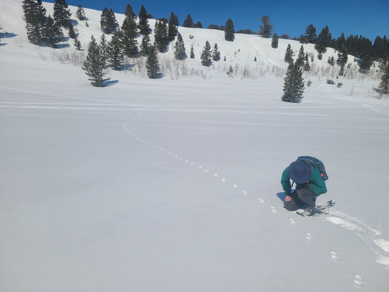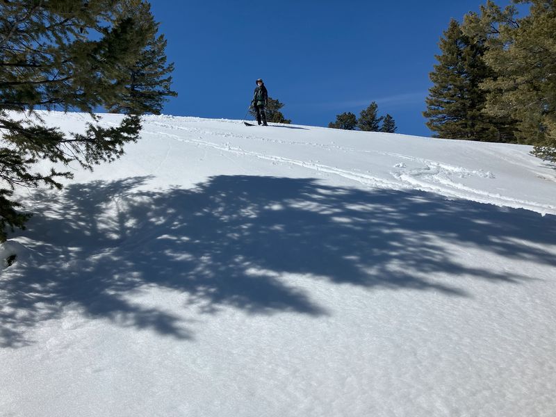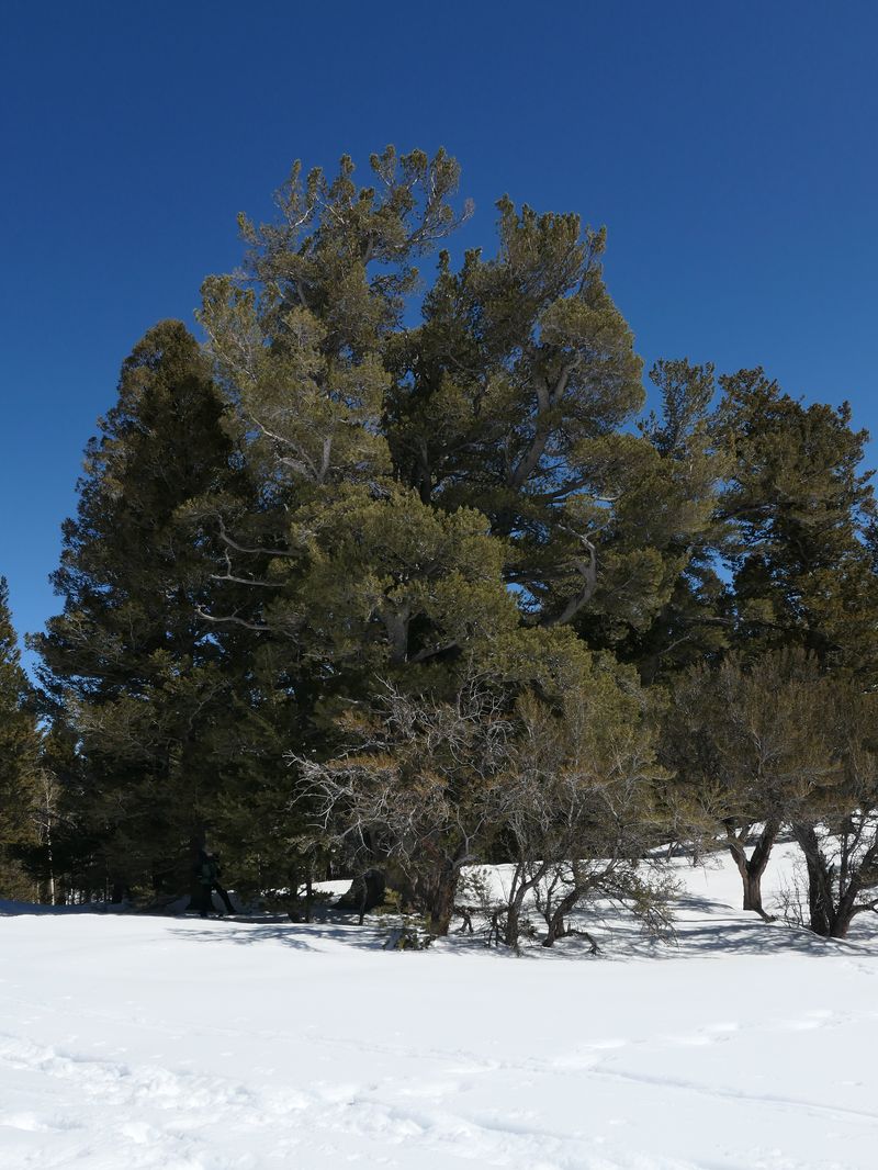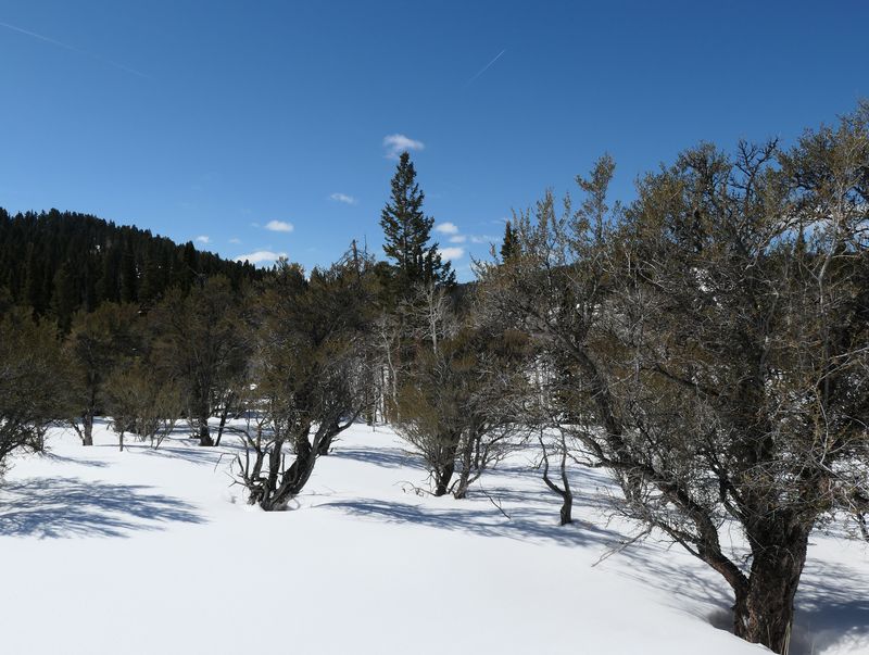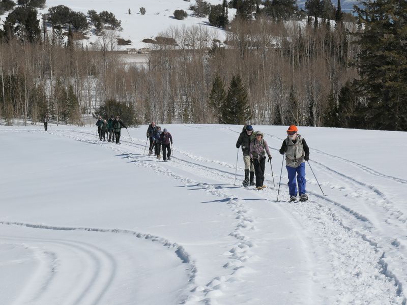 Home Bear Lake Overlook - Limber Pine, 17 March, 2024 Twelve Cache Hikers joined this last activity of winter 2024. At nearly 8000 feet, this trip from Bear Lake Overlook to Limber Pine always has reliable late-season snow. Carpools were organized at Smith's and we drove 34 miles up Logan Canyon and over Bear Lake Summit to the Bear Lake Overlook. Snowshoes and cross-country skis were donned and we headed west over a deep snow base with a couple inches of new snow on top. After stopping for a group photo at the campground, we climbed south through a large open slope. We followed our usual route, turning to the west as we continued our ascent to a low spot on the ridge. That route follows a fence line, but the snow was so deep that only a few post tops were visible. From the ridge, we turned around to admire a great view Bear Lake, with distant mountains mirrored in its sky-blue water. We then left the ridge with its mountain mahogany trees and took a contoured route through the timbered north-facing slope, eventually emerging into an open area directly south of the Old Limber Pine. A final ascent up the slope took us to the old tree, but we didn't tarry there. Instead, we headed west to the main ridge and a view of Middle Sink. The exposed ridge location was windy, so most of the group went to a more sheltered spot for lunch. It was St. Patrick's Day, so we shared green cookies. The area east of Middle Sink is reserved for non-motorized winter recreation although we often encountered snowmobiles here. This year, however, the Forest Service had placed signs along the ridge and only a few snowmobiles had encroached into the restricted area. After lunch, we took a more southerly route for our return. Several people split from the main group on the way back and traveled though the campground while the others went to the track we made on our initial ascent. This was a pleasant trip, with outstanding views, good weather and snow conditions and good company, too. Trip Summary: