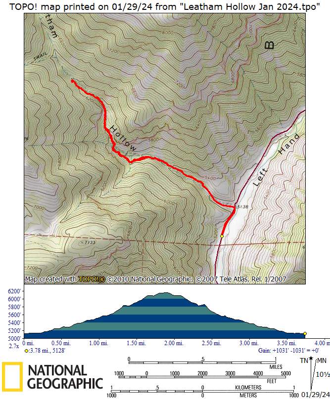 Home Leatham Hollow, 28 January, 2024 Twelve people, all in snowshoes, went on this trip to Leatham Hollow. This was the first time the group had done this hike in the winter. Alex, Bree, Brent J, Brent L, Darcie, Dave P, Dave W, David, Jane, Kathy, Laurel, and Ralph (Leader). After introductions at the Smith’s parking lot on main street, we split up and carpooled 15 miles, through Blacksmith Fork Canyon, to Left Hand fork and the winter parking lot. Unseasonably warm weather the previous week resulted in a muddy versus the normal snowy parking lot. We briefly discussed the avalanche dangers, which were much improved from the previous couple of weekends. We started out about 10:45 under sunny skies and hiked about 0.3 miles to the Leatham Hollow Trailhead. That was the easy part. After a group picture at the trailhead, we headed up the Leatham Hollow Trail. The first half-mile of the trail was packed well from previous hikers and snowshoers. After that point we broke the trail, making for a much more strenuous trek up the hollow. The trail followed a snow-covered stream bed with views of snowy and craggy cliffs along both sides. We took breaks along the way to rest and enjoy the winter scenery. Along the way we observed deer and moose tracks, and eventually an area where there had been a recent avalanche. We reached Leatham Hollow Spring about 12:10 after a strenuous trek through the unpacked snow. We decided to stop for lunch rather than continuing to the switchbacks a little further up the trail. Between the 1000 feet of ascent and the soft snow most were ready to eat and head back down. After lunch a few of us went up a short distance to the switchbacks and then returned to the group. We headed back down at a much-improved pace and arrived at the parking lot at about 1:45. On the way down we saw two snowshoers (Rose and a friend) who were thankful we had packed the trail for them. Trip Summary: