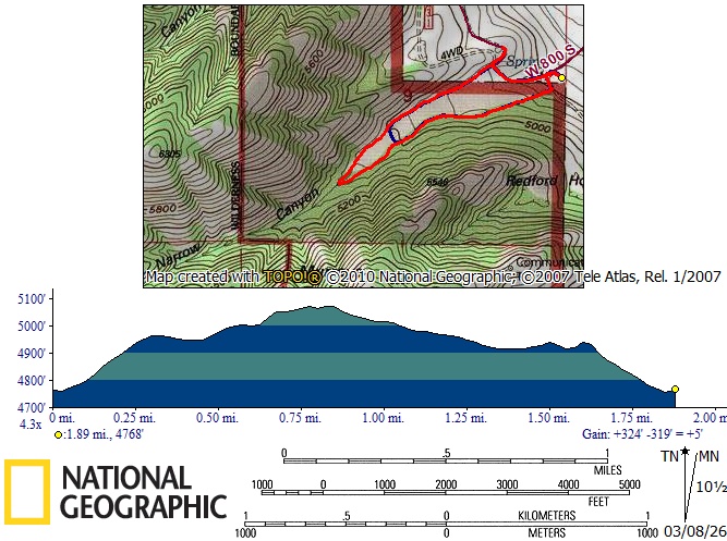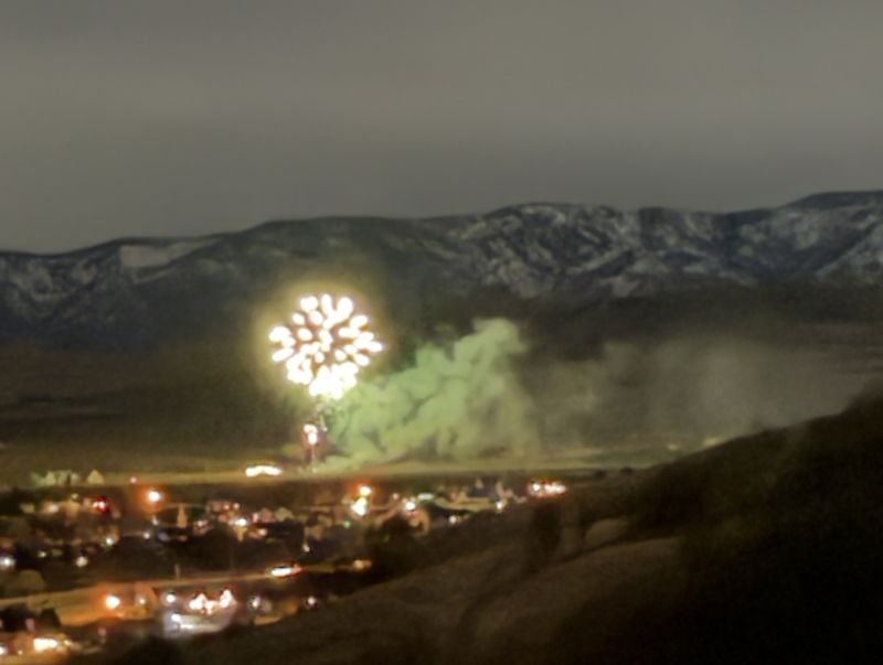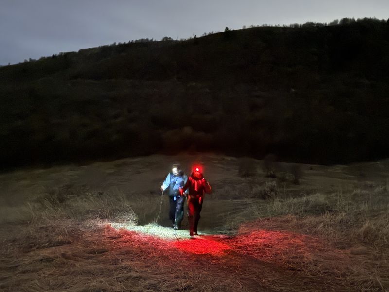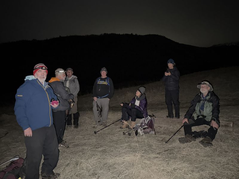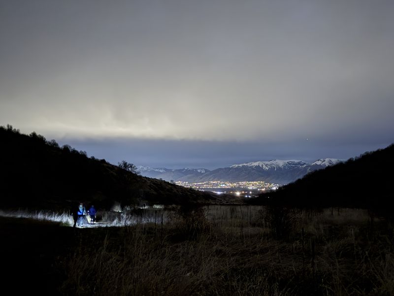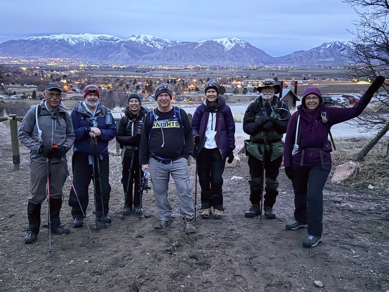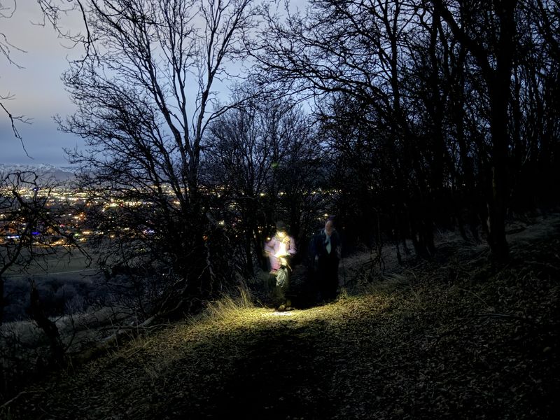 The group proceeded up the south edge of Narrow Canyon amongst the trees for approximately one mile to the trail junction, then returned down the canyon via the mid- canyon trail. Trail conditions were muddy and slick on the outbound leg, although not terribly so, and the inbound leg had plenty of mostly dry footing adjacent to the trail. Near the mouth of the canyon, the hikers diverted north and climbed up to the top of the bench to enjoy a nice clear view of Cache Valley at night. A conveniently placed railroad tie served as a nice seat while snacks were consumed, and the evening ended with a bonus private fireworks display south of the trailhead in Mt. Sterling. Although not anywhere near the planned evening snowshoe, a pleasant time was had. Trip Summary: