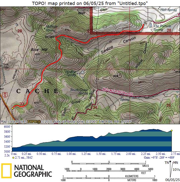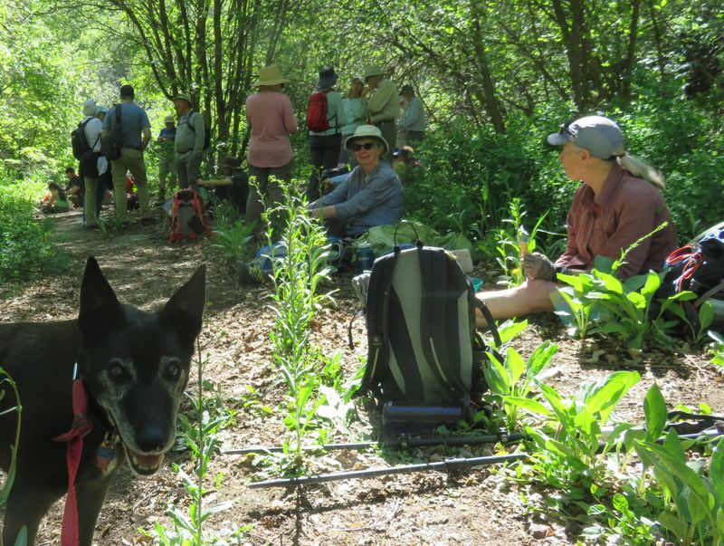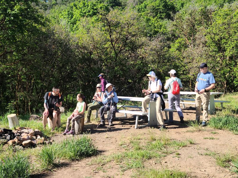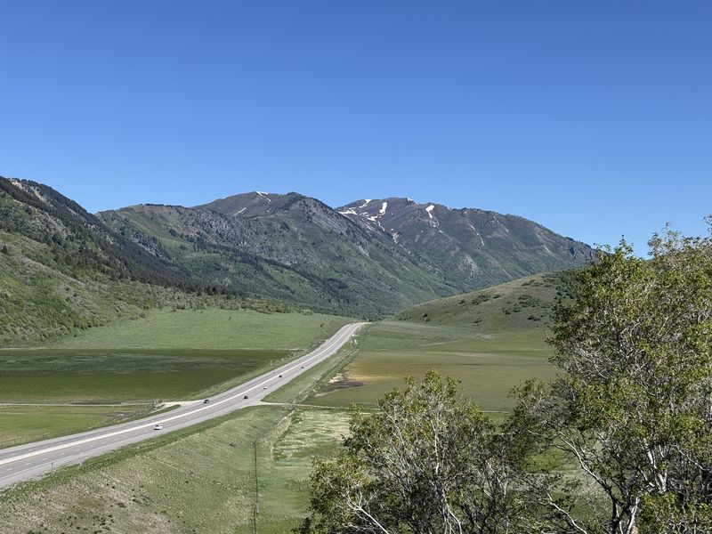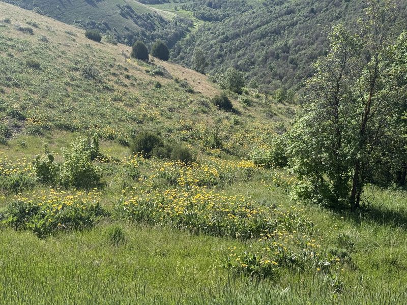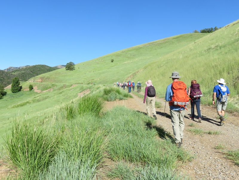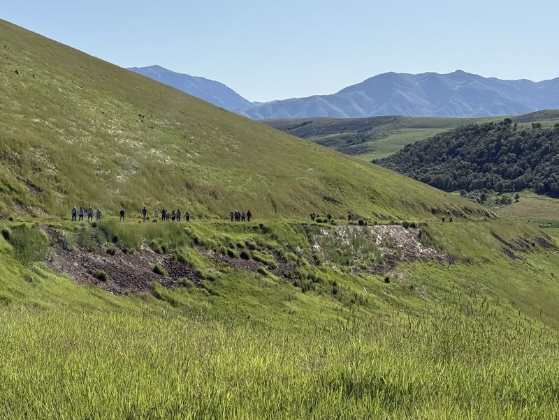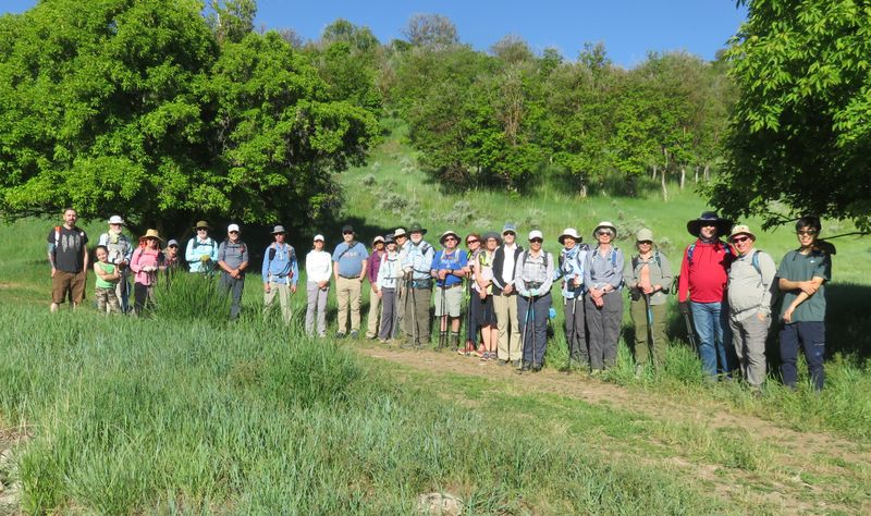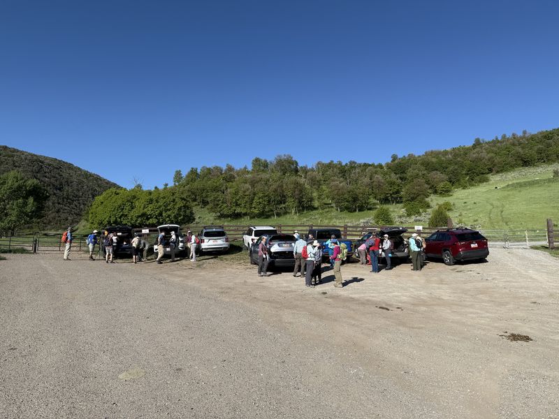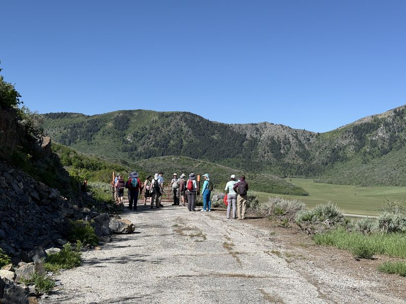 Home Old Sardine Road, 25 May, 2025 Something unusual must have been in the air on this fine Memorial Day weekend, as twenty-seven people and one dog turned out for this hike, a record number for any Cache Hikers outing. This was a good hike to accommodate our numbers, since we walked on a road the whole way and there were no junctions where someone could be led astray. The weather was quite benign as well, starting out in the 60s and reaching the low 70s at the end, with only a few decorative clouds over the mountains. We enjoyed the great views, spring green hillsides, and scattered wildflowers. We walked to a fence across the road where we looked down on the noisy Highway 89/91 below, then turned back and found a shady spot for a snack break. Some hikers found fossils in the limestone outcroppings along the last half mile or so of road. On the return trip eight hikers took an alternative route where they encountered even more wildflowers. David shared a YouTube link to a video of our hike. Trip Summary: