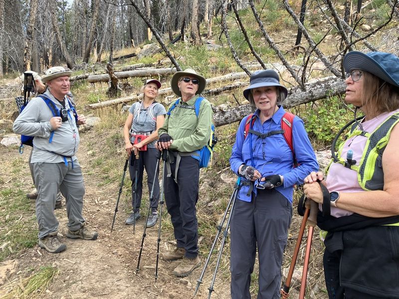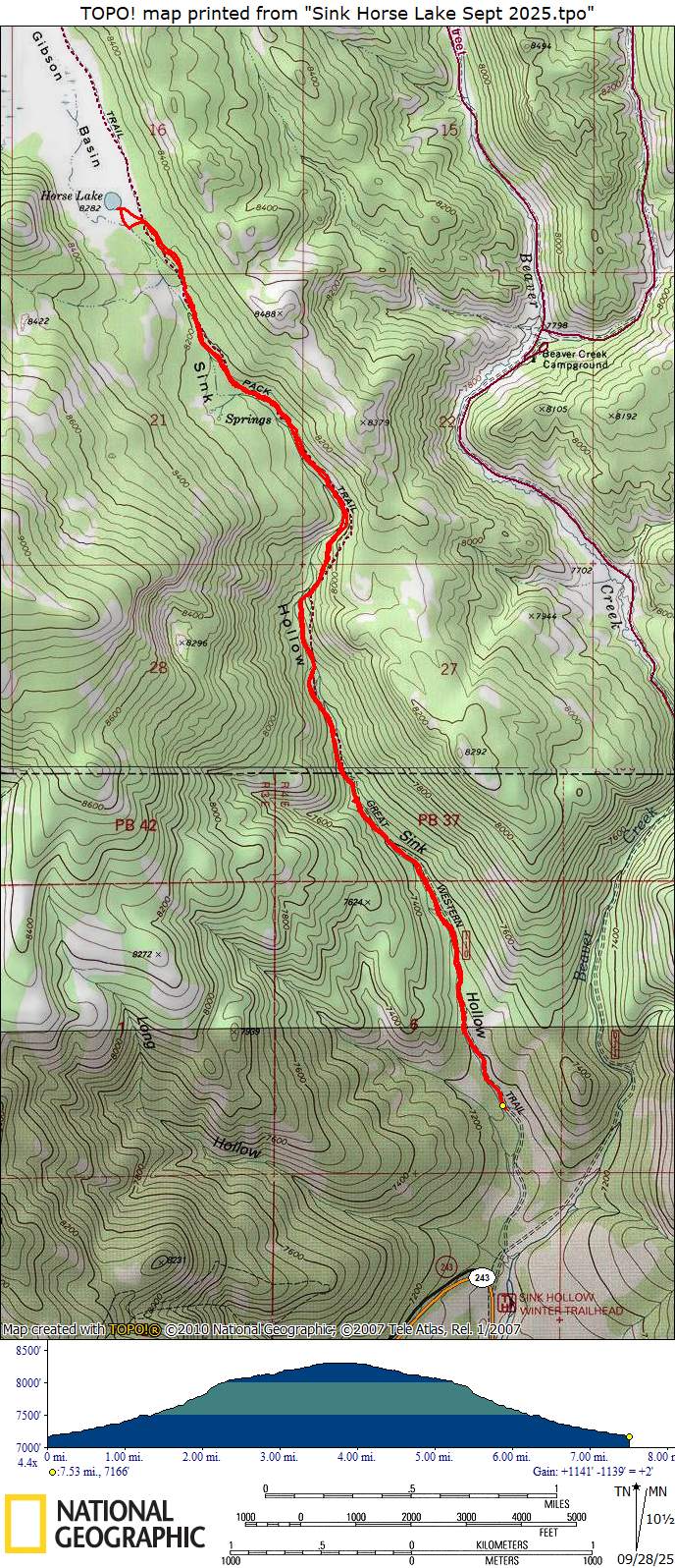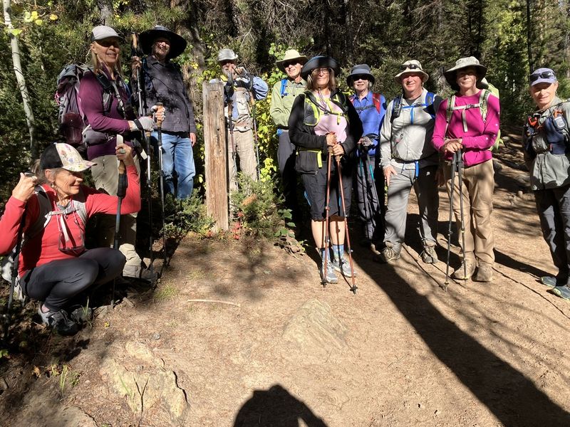 Home Horse Lake, 21 September, 2025 Twelve hikers met at the usual rendezvous of Smith’s Marketplace at 8am on Sunday. Another hiker drove over from Bear Lake to meet us at the Sink Hollow parking lot. We followed the rough dirt road just beyond the parking lot to get about 0.5 mile further into the lightly wooded area than we are able to in the winter, and parked in a small open area on the left. One hiker left the group to do Stump Hollow trail maintenance. The Sink Hollow trail starts in mixed meadow and young trees that were logged a few years ago. The trail enters denser forest and narrows down considerably, with an apt warning sign that vehicles must be less than 50 inches wide to get through the trees. The winding narrow trail gradually ascends past a large sinkhole to the Utah-Idaho border. Unfortunately, the photo opportunity sign marking the border has been removed, leaving only a bare post. One of our hikers used her trusty felt marker to show the boundary. This is the usual end point for our winter trips, but we continued on toward Horse Lake. The trail crosses a still-flowing small creek and then ascends more steeply for a ways. The footing on the uphill section was good and the total elevation gain was a very reasonable 1100 feet. There still was evidence of the 2016 fire, but lots of new growth, too. Four young dirt bikers passed us heading up the trail then passed us on the downward trek. For the final mile, the trail leveled out and the forest opened a bit. We got to the south end of Gibson Basin and Horse Lake about 11:30am. A couple of ATVs had bowhunters scouting the area. There was some water in Horse Lake, which was surprising given our dry summer. The cool breeze encouraged us to retreat to the edge of the forest for lunch. The forecast had predicted some rain for the afternoon, but we had mostly blue skies with pleasant fall day temperatures. We got back to the vehicles by 2 pm. Returning to Logan was slowed by the single lane construction sections, but we were all back to town about 3pm. A lovely fall hike in the woods. Trip Summary: