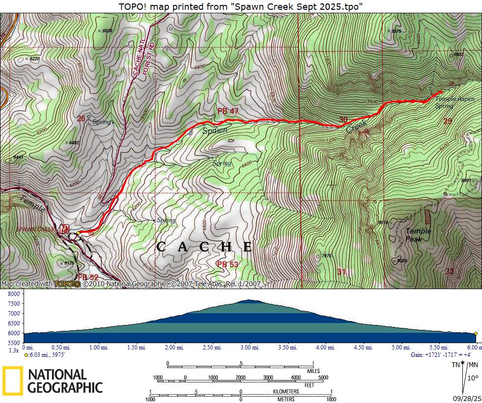 Home Spawn Creek, 28 September, 2025 Fourteen Cache Hikers left Logan shortly after 8 AM for a fall hike: Bruce, Brent L., Dave P., Jane, Jim, Kamren, Laurel, Linda, Nancy, Ralph, Richard, Sue, Susan (leader), and Teresa. The group began the hike from the Worm Fence / Spawn Creek trailhead parking area. An additional hiker stayed behind to perform weed management in the Temple Fork area. The forecast called for a 50% chance of showers and thunderstorms after noon, but skies remained mostly cloudy with some sun for the duration of the hike. Temperatures overall were pleasant. Beavers had been busy upgrading some of the pond dams along the trail making each trip to this trail a delightfully different experience! Bigtooth maple and aspen as well as mountain ash (in fruit) and other shrubs were well into their yellow, orange, and red fall colors. Berries were abundant along the trail. These included chokecherries, elderberries, and some tasty but shriveling serviceberries. As usual, we stopped briefly to look at the old mill site. Evidence of mountain bike trail enhancements was observed. Several jumps had been established, and vegetation cleared along the trail edges. No other hikers or bikers were encountered during this hike. Upon arrival at Temple Aspen Spring, a few hikers climbed down into the drainage and noted water seeping from the spring. Hikers ate lunch next to the trail above the spring. The return descent was through lovely fall foliage along a sequence of beaver ponds with views of distant slopes covered with great fall color. Overall, a lovely fall hike! Trip Summary: