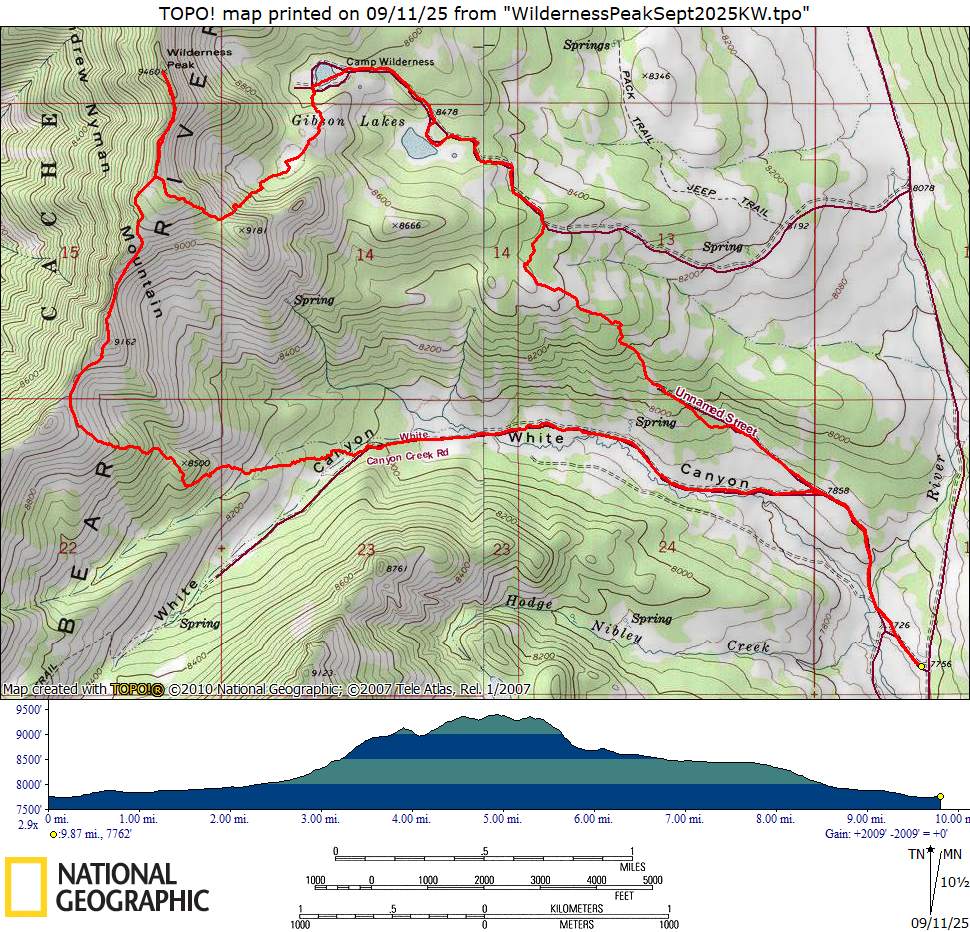 Home Wilderness Peak, 7 September, 2025 Nine hikers met and departed from Logan and were joined by one more at the Franklin Basin turnoff in Logan Canyon. Roads were quite wet with plenty of puddles, evidence of much more rain in the mountains than was received in the valley. We were saved from the recent summer dust but started with wet pants. Leaving the parking spots at 9:10, we first passed the gate barring vehicular access to White Canyon Road and walked right across the Logan River. The White Canyon trail, though braided with cow paths, was clear and in relatively good shape for the whole time that we were on it. After about two miles, we branched onto the route of a trail mapped as Crooked Creek. Overall, this trail does not remain visible on the ground; occasionally, cow paths matched the route, but it is impossible to tell whether any of them were actually left from the original trail. The growth suggests that it has been out of use for many decades. Much of the route from here to the ridge was steep but not horrible with good directional planning. The ridgetop offered wonderful views in all directions–south into upper Boss Canyon and toward Doubletop Mountain and Cherry Peak, west toward Gunsight Peak and Oxford Peak, east and north to the far stretches of the Bear River Range and beyond. Patches of rain were observed crossing Cache Valley and reaching the higher parts of the range, mostly bypassing us. The ridge generally has a weak but unmapped trail from traditional use. A couple ups and downs remained before the peak. Once we reached the main body of the peak, we split between hiking on the very top and a trail just below, eventually settling on the lower for ease. All but one continued all the way to the top. Lunch followed immediately on an easier slope just to the south. We rounded the mountain, following one spur down to the point where a steep trail descends into one of the cirques and out to Gibson Lakes. Along the way, we found a small spring that flows into a sinkhole after only a brief stay above ground, the spring and the sinkhole both easily visible from the trail. Pipes were still visible above ground here and along the way down to the west Gibson Lake. These are believed to have supplied the former Boy Scout camp, Camp Wilderness, with water. This was the only obvious remnant of the camp that was out of operation by the mid 1970s. The first lake was largely grassy, filled in, and dry from the summer, and the group chose to walk across the lake rather than taking the road. The other lake, much larger around but fairly shallow, formed a beautiful view with the great slabs of Wilderness Peak and the white rock face of the south spur of the mountain. From there, we continued down the road until we came to either a camping spot or the beginning of an old road. We treated it as a road and found a natural route with hints that it once was an actual road leading down into White Canyon and joining a faint yet still mapped road that connects to the mail trail. It was a wonderful and unique day with interesting and dramatic views and a real wilderness experience. All left thoroughly exhausted but hopefully just as enriched. Trip Summary: