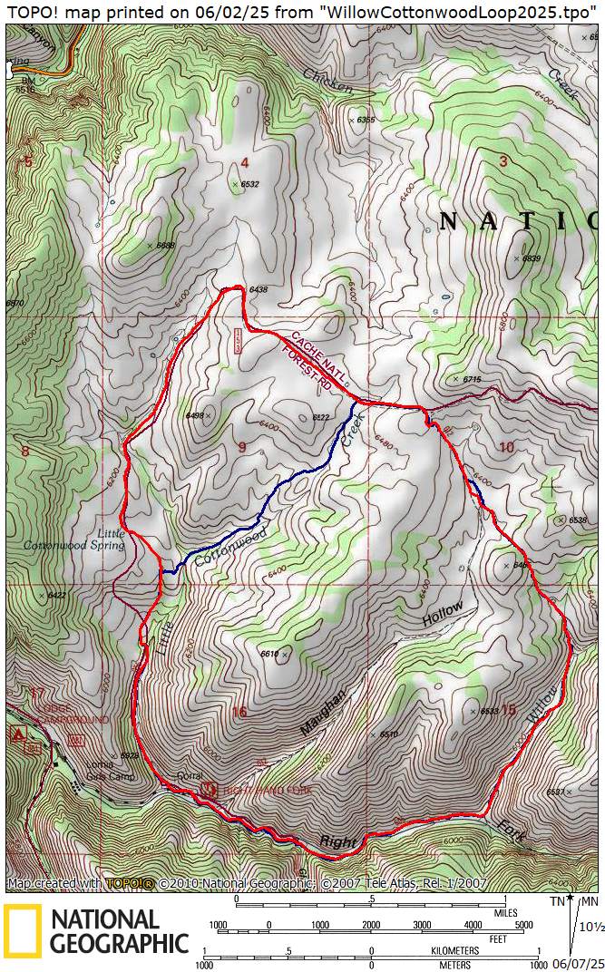 Home Willow Creek - Cottonwood Loop, 1 June, 2025 Twenty hikers and two dogs gathered at the Smith’s Marketplace parking lot at 8 a.m. to carpool to the Right Hand Fork Trailhead on a beautiful sunny late spring morning. Carpools arrived at the trailhead at about 8:30 a.m. Hikers started on the trail about 8:40 a.m., stopping for a group photo near the trail sign. Hikers continued to the Willow Creek Trail. After about two miles, the group left the trail at a sharp bend/switchback and small stream crossing and headed northwest on an unmarked route. This path was partly muddy and continued to a small cow pond through abundant wildflowers. From there, the footpath became less well-defined, and the group continued cross-country through a spectacular meadow of full bloom mule-ears (Wyethia amplexicaulis) and then north through a wide-open basin at the head of Maughan Hollow. This year’s wildflowers included mule-ears, American bistort, mountain dandelion, larkspur, Gray’s biscuitroot, hawthorn & chokecherry shrubs, as well as stands of blue camas (Camassia quamash). The group proceeded northwest across the basin toward the ridge saddle. The Little Cottonwood jeep road is located just beyond this point. As per tradition, the group stopped for lunch at a shaded rocky spot near some big tooth maples on the ridge near the road at about 11a.m. Views of Mt Elmer, Beirdneau Peak, Logan Peak, Logan Canyon, and the Cache Valley and Wellsville Mountains are particularly striking at this location. This year, there was some snow remaining on the peaks but not as much as in recent years. Following lunch, the group continued along the jeep road. Similar to last year, not far down the road, the hikers split into two groups. Nine hikers took an overland cutoff that headed west from the jeep trail. Laurel had previously explored this area. Eleven hikers and the two dogs continued travel on the traditional route. The two groups reconvened below the stock tank in a field of Mule ears to continue the hike. Unfortunately, the large field of normally blooming blue camas was dry with flowers likely having peaked a week or so earlier. The group continued down through Little Cottonwood Canyon to the corral and parking area. Trip Summary: